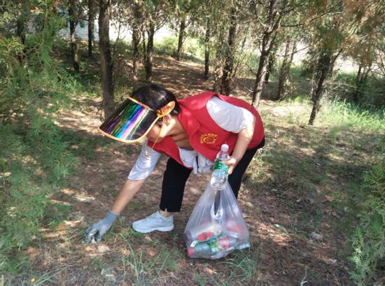 上午九时,炙热的太阳下,志愿者身着红袖章、红马甲等志愿者标志,手持垃圾袋从景区大门开始向陵墓山下进行地毯式捡拾垃圾活动。
