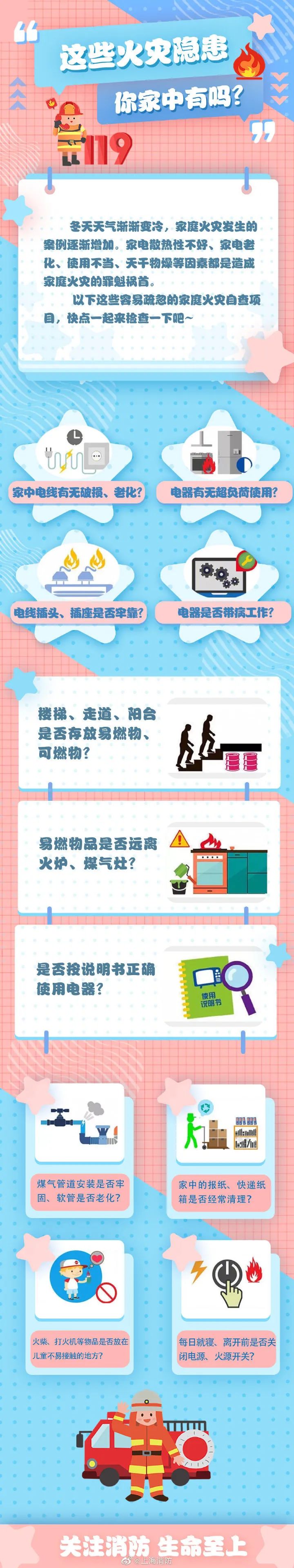 冬季火灾,多数发生在我们的居住环境当中。增强家庭防火意识是非常必要的。这些火灾隐患你家中有吗?一起根据下图来一次消防安全大检查吧!