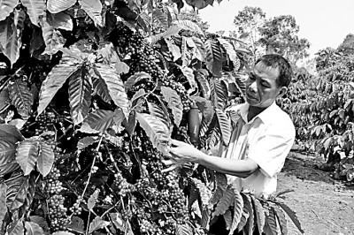 香饮所首席专家龙宇宙察看咖啡生长情况。资料图片