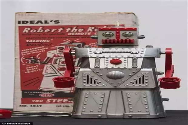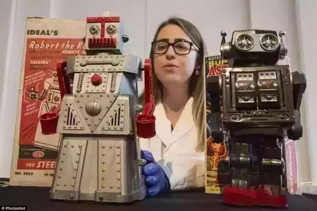 这次展览将帮助游客发现类人机器人的文化、历史以及技术,并允许他们与12个展出机器人互动。图中是分别造于20世纪50年代和70年代的玩具机器人。