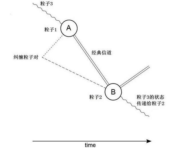制备一个纠缠粒子对,将粒子1发射到A点,粒子2发送至B点;在A点,另一个粒子3携带一个想要传输的量子比特Q;A点的一方利用经典通讯方式,例如电话或短信等,将自己的测量结果告诉B点一方;B点的一方收到A点的测量结果后,就知道了B点的粒子2处于哪个态。