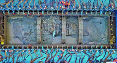 11月25日下午,为长江口二号古船整体打捞迁移而设计建造的专用打捞工程船“奋力轮”怀抱着古船,平稳驶入位于杨浦滨江的上海船厂旧址1号船坞内。古船弧形梁沉箱稳稳地落座至预先浇筑的马鞍座上。