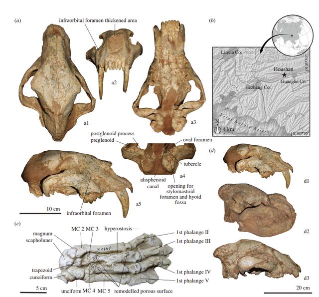 近日,在位于青藏高原东北部甘肃省临夏盆地约900万年前的大深沟动物群化石记录中,科研人员发现了一种大型剑齿虎类,其形态与800万年至500万年前中国、欧洲和北美的近剑齿虎(剑齿虎亚科的一员)形态近似,系统发育分析结果支持这种大型剑齿虎是已知最早的近剑齿虎。因化石发现于和政县,将其命名为“和政近剑齿虎”。
