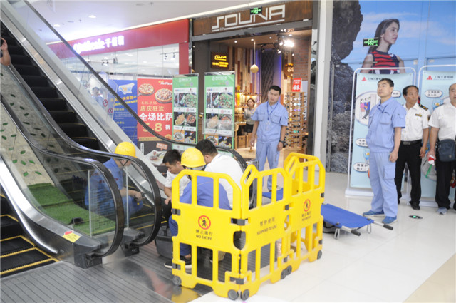 演练中,被困人员按下警铃,与物业值班中心对讲,描述被困情况,请求救援。五分钟后,救援人员赶到现场。在询问被困人员基本情况,并确定轿厢位置后,救援人员利用蓄电池供电移动轿厢,将轿厢移至能够供被困人员离开的位置,救出被困人员,整个救援过程在10分钟内完成。随后还在万达 广场一楼进行了扶梯救援演练。通过演练,进一步提高了特种设备安全保障能力,为园区经济社会发展提供了有力的特种设备安全保障。