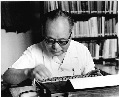 程开甲在打字机上撰写论文。资料照片