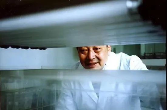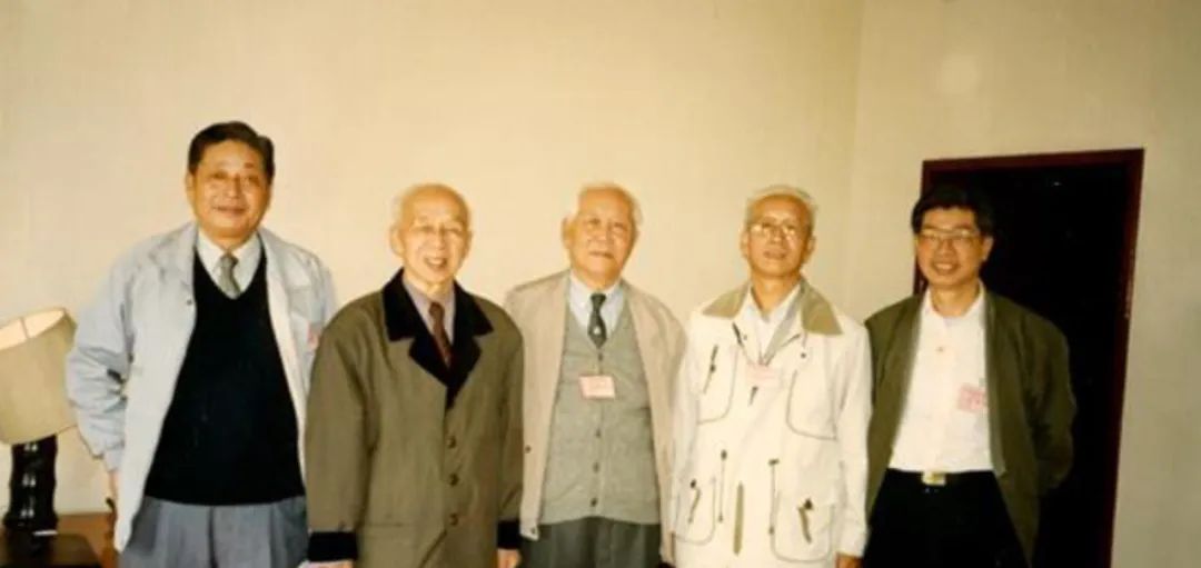 1995年,陈子元(右三)与核农所教授们一起在资料室讨论生物物理学博士生培养方案