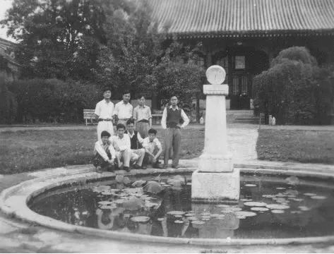 ▲ 1947年北京大学理学院大讲堂前荷花池畔,后排左3为于敏