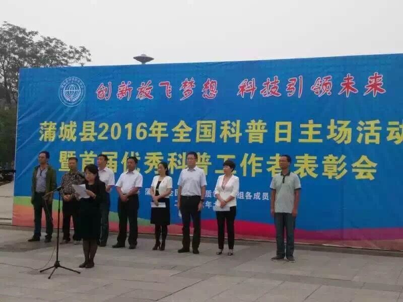 9月21日,蒲城县2016年“全国科普日”主场活动暨首届优秀科普工作者表彰会在县城中心广场举行,县委、人大、政府、政协的主管领导出席,32个科素成员单位主管领导、参与科普宣传的科技工作者以及600余名群众参加。主场活动暨优秀科普工作者表彰会由政府副县长梁梅主持,县委常委、组织部长石雨宣读表彰决定,并为张建民、秦东平、曹蕊、樊印平、张明建等5名优秀科普工作者颁发了证书及奖金,县科协主席丁晓玲对蒲城县2016年全国科普日活动进行了部署安排。