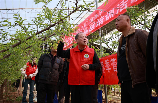 在当地设施冬枣大棚内,宋民斗老师结合三月份气候多变的特点,以实地果树管理为依托,分树体管理、肥水管理、温湿度控制三个方面,系统全面地讲解了枣吊伸长期的管理要点和技术手段,针对种植户提出的地膜铺设、枣吊过长等各类问题,宋老师以目标为导向,从理论依据到具体措施,引导种植户们加强管理、科学种植。