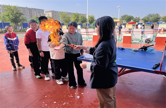与此同时,渭南市科技馆带来的科学实验秀成为整场活动的“高光时刻”。科技馆辅导员们以趣味横生的形式,演示了如“火焰掌”、“静电飞花”等一系列蕴含深刻科学原理的实验。现象震撼,讲解幽默,互动热烈,学生们在惊呼与欢笑中,直观理解了物态变化、伯努利原理、静电现象等科学知识。这一刻,科学不再是书本上遥远的公式和定理,而是充满魔力与惊喜的探索旅程,它变得可触、可感、有趣而迷人,就在这秋日的校园里,生动地绽放着。