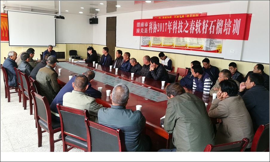 4月11日,潼关县桐峪社区马口村,由渭南市科协、潼关县科协共同举办的“科技之春”宣传月软籽石榴培训现场,石榴专家柏永耀刚一到地里,就引来了群众的阵阵疑问。面对果农的问题,柏老师一边有针对性地挑选出果树指证,一边现场作答: