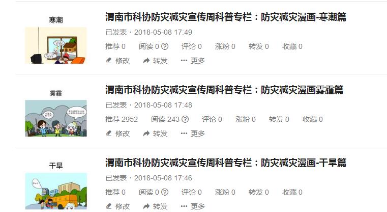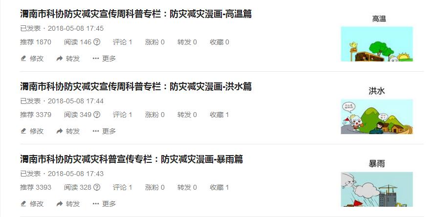 为扎实开展防灾减灾科普宣传,渭南市科协紧紧围绕“行动起来,减轻身边的灾害风险”的活动主题,充分利用头条号、微信公众平台等新媒体开展防灾减灾科普宣传,在渭南科普网头条号上开通“防灾减灾宣传周科普专栏”,集中编辑发布了一批防灾减灾科普知识。内容包括:全国防灾减灾日的来历、防灾减灾小口诀、雾霾、寒潮、高温、干旱、洪水、暴雨、雷电、台风等防灾减灾系列漫画,向公众推送,要求科普志愿者利用各种微信平台、微信群、QQ群等扩散,使公众第一时间便捷、迅速地接收到防灾减灾科普知识,收到良好的效果。
