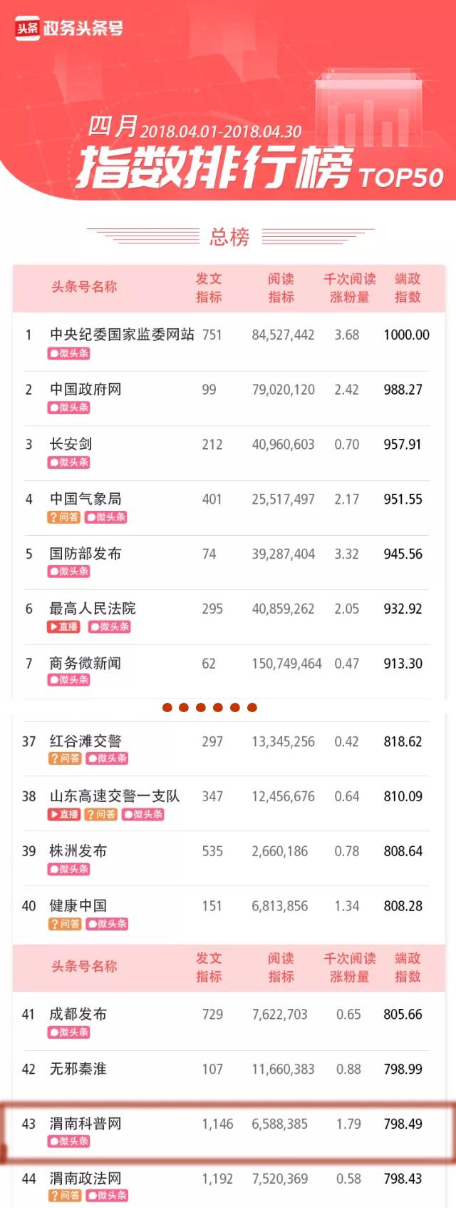5月4日,今日头条发布4月份全国政务类头条号榜单。渭南科普网以989篇发稿量、6444.4万阅读量荣获全国科学类头条号排行榜第二名。同时,在各类榜单总榜排名名列全国第43名。