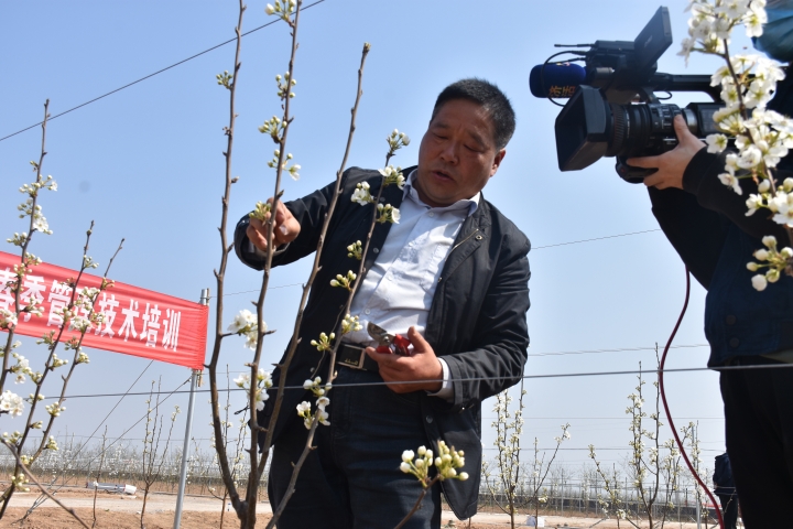 3月23日中午11时,渭南市第二十八届“科技之春”宣传月第四场线上直播线下分散实用技术培训活动走进蒲城。本次活动由渭南市科协、蒲城县科协主办,蒲城酥梨试验站农业专家服务站、蒲城县果业发展中心承办。陕西省梨现代农业产业技术体系岗位专家、渭南市梨产业化专家工作站首席专家缑耀武就酥梨春季管理技术给广大果农作了在线培训。渭南电视台渭水之南、华山网全媒体平台对活动进行现场直播。