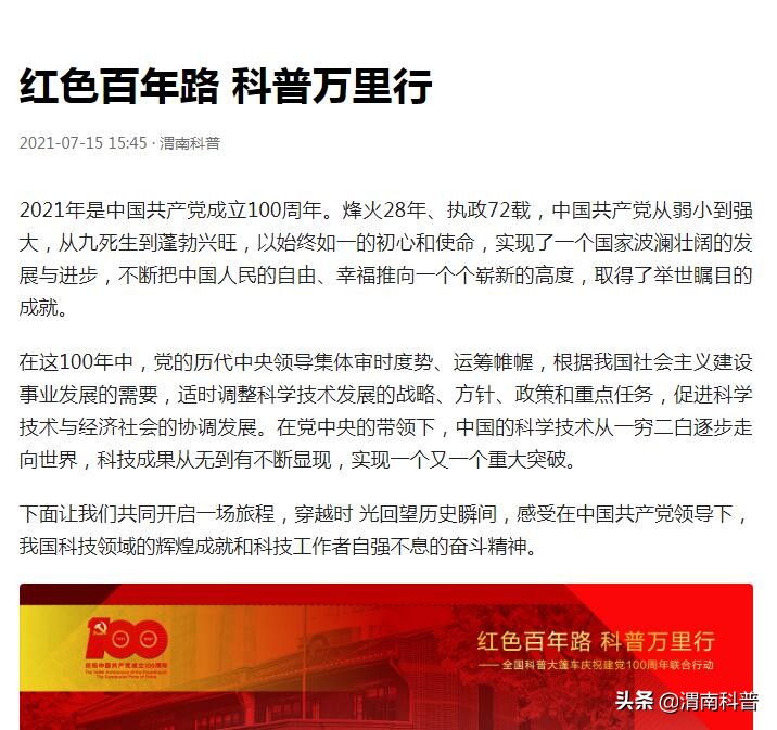 二是7月15日,利用渭南科普头条号,发布中国科协制作的庆祝中国共产党建党100周年科技成就宣传片、“红色百年路 科普万里行”红色画廊,利用渭南科普、渭南科技志愿服务、渭南市天天信息员等微信群进行推送,大力宣传在中国共产党领导下,中国的科学技术从一穷二白逐步走向世界,科技成果从无到有不断显现,实现一个又一个重大突破的辉煌成就。