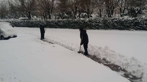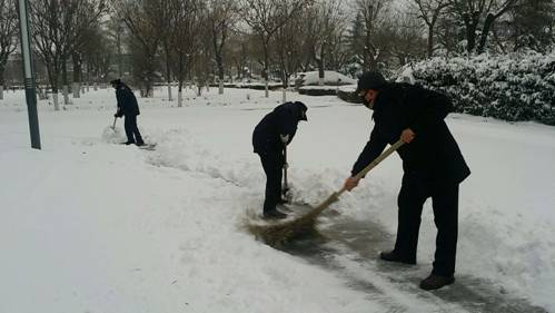 经过一个多小时的奋战,大家终于将学校的主要入口、主干道等地的积雪全部铲除,为教职员工和来访客人开辟了一条洋溢着温情的通畅之路。虽然大家的衣服、鞋子都弄湿了,也出了一身的汗,可看着眼前的成果,大家都很有成就感,每个人的脸上都洋溢着开心的笑容。