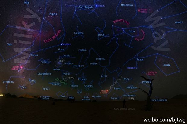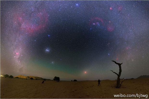 说明: 太阳的相反方向有什么值得看的?上个月的某天夜晚有不少可看的。首先,位于这幅精彩影像右下方的红色发光球体是一轮满月,因为它进入了地球的影子所以变暗又泛红。在地球锥形暗影之外,绕行太阳的尘埃微粒反向散射阳光形成了对日照,可以看到这条模糊光带从中央地平线升起,并延伸到月亮后面。还有一条近乎水平的绿色气辉带在地平线上清晰可见,部分被吹起的橙色沙子遮挡住了。在遥远天空中位于影像顶端的蓝色光点是天狼星,而银河系中央带从影像左侧以拱形延伸至右侧。影像中央左侧的弥漫光斑则是大和小麦哲伦星云。天空中还散布着数量众多的红色发射星云,可进一步参考附随的注解影像。影像前景是纳米比亚.纳米布-诺克路福国家公园荒凉的死亡谷,呈现了一位天文摄影家亲临现场感受星空的奇妙场景,据他所言这是他此生的巅峰经历之一。