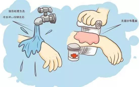 急救办法:一旦发生烫伤后,立即将被烫部位放置在流动的水下冲洗或是用凉毛巾冷敷,如果烫伤面积较大,伤者应该将整个身体浸泡在放满冷水的浴缸中。可以将纱布或是绷带松松地缠绕在烫伤处以保护伤口。