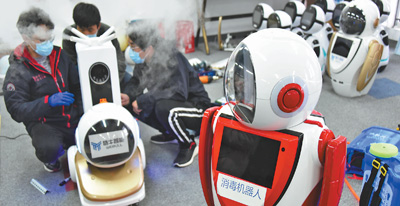 近日,山东省青岛市工信局召集辖区部分科技企业,陆续研发和改装出可替代人工的消毒机器人,并已开始在部分医院感染科隔离区投入试用。图为11日,技术人员在调试二代消毒机器人。