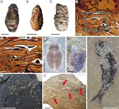 剖面产出的各类代表性化石。A-C, 鱼粪;D-E,鱼粪切片;F和G,甲虫;H,鱼;I,介形虫;J,鲎虫。受访者供图