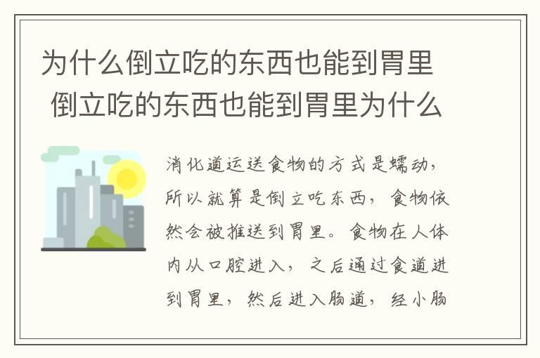 消化道运送食物的方式是蠕动,所以就算是倒立吃东西,食物依然会被推送到胃里。食物在人体内从口腔进入,之后通过食道进到胃里,然后进入肠道,经小肠、大肠、直肠,最终经肛门排出体外。