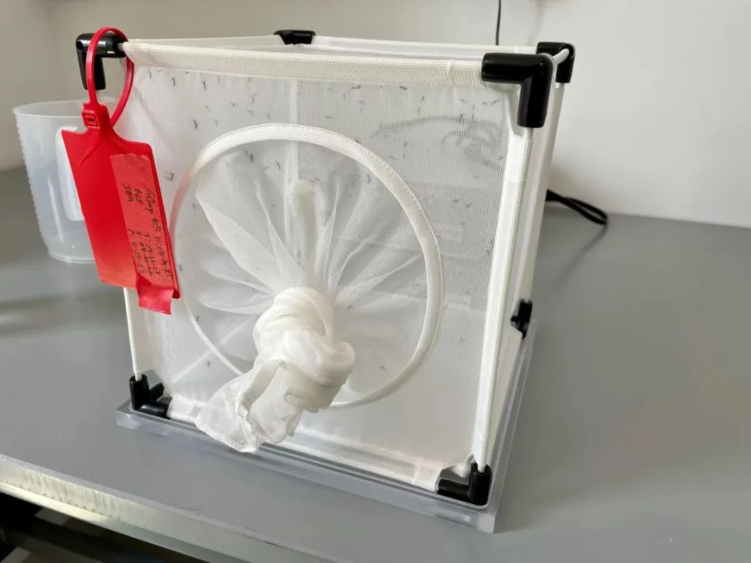 他会从蚊子笼侧面的网纱袖套伸进胳膊,让雌蚊子吸取血液。他总会在喂食时戴着手套,这能避免手掌被蚊子叮咬。图中的一笼蚊子约有 500 只,喂饱一只蚊子大约需要 2 分钟时间,为了让大家尽可能都吃到,他每次会让胳膊在笼中待上至少 10 分钟。喂蚊子的具体频率由实验需求决定。