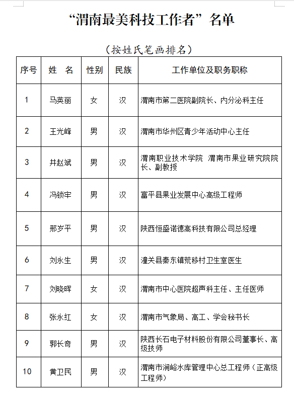 根据渭南市委组织部、市委宣传部、市科技局、市人社局、市科协联合印发的《关于开展 “寻找渭南最美科技工作者”活动的通知》(渭科协发【2020年】4号)精神,渭南市委组织部、市委宣传部、市科技局、市人社局、市科协在全市范围内联合组织开展了 “寻找渭南最美科技工作者”活动。经过推荐申报、资格审查、专家评审、组委会审定等程序,最终确定马英丽等10名同志为“渭南最美科技工作者”,现予以公示,公示期5个工作日(5月22日至5月29日)。