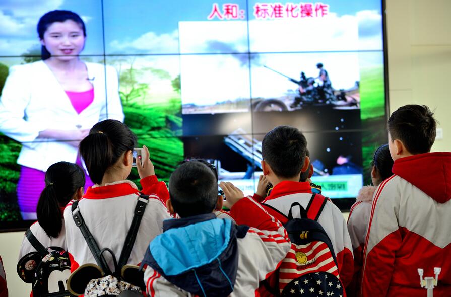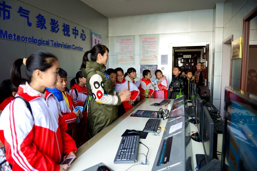 在人工影响天气指挥中心,小记者刚一走进办公室,目光就被一个类似火箭筒的物体所吸引,围在工作人员身边争论起这个“不明物体”在气象领域中的作用。工作人员现场向小记者讲解了人工降雨中火箭弹的工作原理以及人工降雨的时间、空间、地点等必备条件。通过观看短片和观察模型相结合的形式,学生们了解了气象观测站的风向、气温和降水等观测要素。市气象学会理事长、气象总工程师张永红老师结合去冬以来持续的雾霾现象,向小记者们介绍了雾霾的成因,呼吁他们从小树立环保意识,保护生态环境。