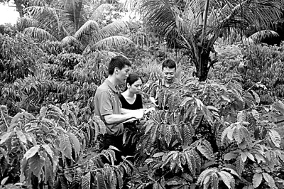 香饮所科研团队在察看咖啡病虫害情况。资料图片