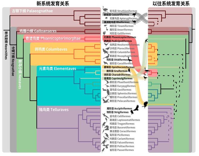 本次研究以更为合理的全基因组范围筛选的基因间区比对序列数据集,重新构建了现生鸟类的系统发育树,提供了一套新的鸟类分类划分方案。