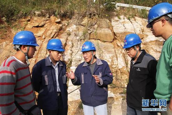 南仁东(左三)与工程技术人员在位于黔南州平塘县的大窝凼施工现场检查施工进展(2014年12月1日摄)。图片来源:新华网