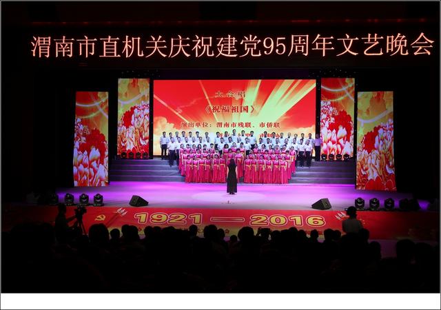 6月28日晚,在喜迎建党95周年和全党上下深入开展“两学一做”学习教育活动之际,渭南 市直机关庆祝建党95周年文艺晚会在渭南市文化艺术中心隆重上演。由市科协、市侨联、市妇联、市残联、市总工会、市贸促会6家单位联合带来的大合唱《祝福祖国》,唱出了中华民族伟大复兴中国梦的新篇章。