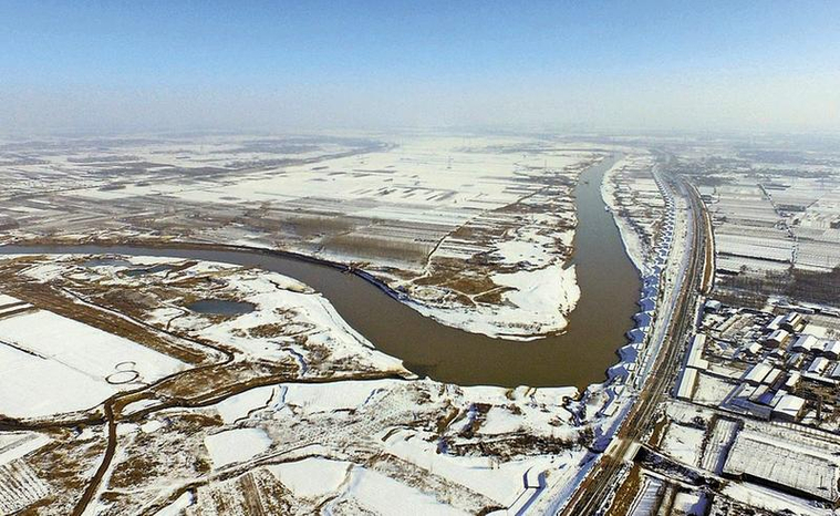 1月10日,航拍之下的渭河渭南段壮美如画。一场降雪过后,渭河给人一种别样的视觉体验,更似“北国江南”。