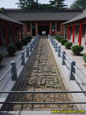 二、十五个砖铺大字:砖铺字所在地起义当年是原高塘小学群体建筑中的校园中心道路,页是纪念馆的中心位置。一九二七年十一月,共产党员教师陈述善、李维俊等组织高塘、谷堆两校师生为悼念李大钊等革命烈士召开追悼大会之时,在校园大道用青砖和鹅卵石铺成长20米,宽2米的巨幅标语:“同志们赶快踏着先烈的鲜血前进啊!!!”这条镶嵌在渭华大地上缅怀革命先烈的特殊标语,在全国革命文物中绝无仅有,被列为国家一级文物。