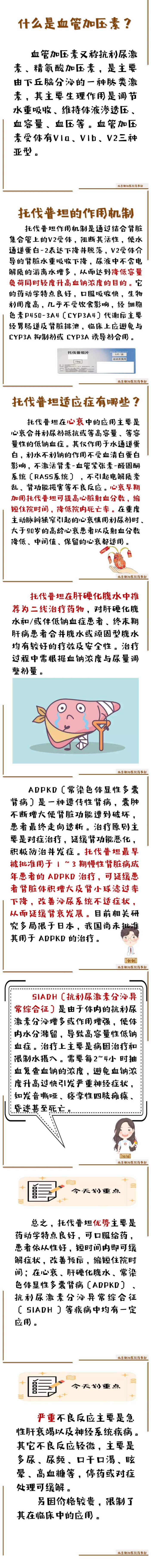 托伐普坦是首个高选择性血管加压素 V 2 受体拮抗剂,2009 年在美国上市,2011年我国上市。主要用于伴随肝硬化、心衰、抗利尿激素分泌异常综合征(SIADH)等高容量或等容量性的低钠血症(血钠浓度<125mmol/L或低钠血症不明显但有症状且限液治疗效果差),还可用于常染色体显性多囊肾病(ADPKD)的辅助治疗,以延迟进入肾脏替代治疗的时间。