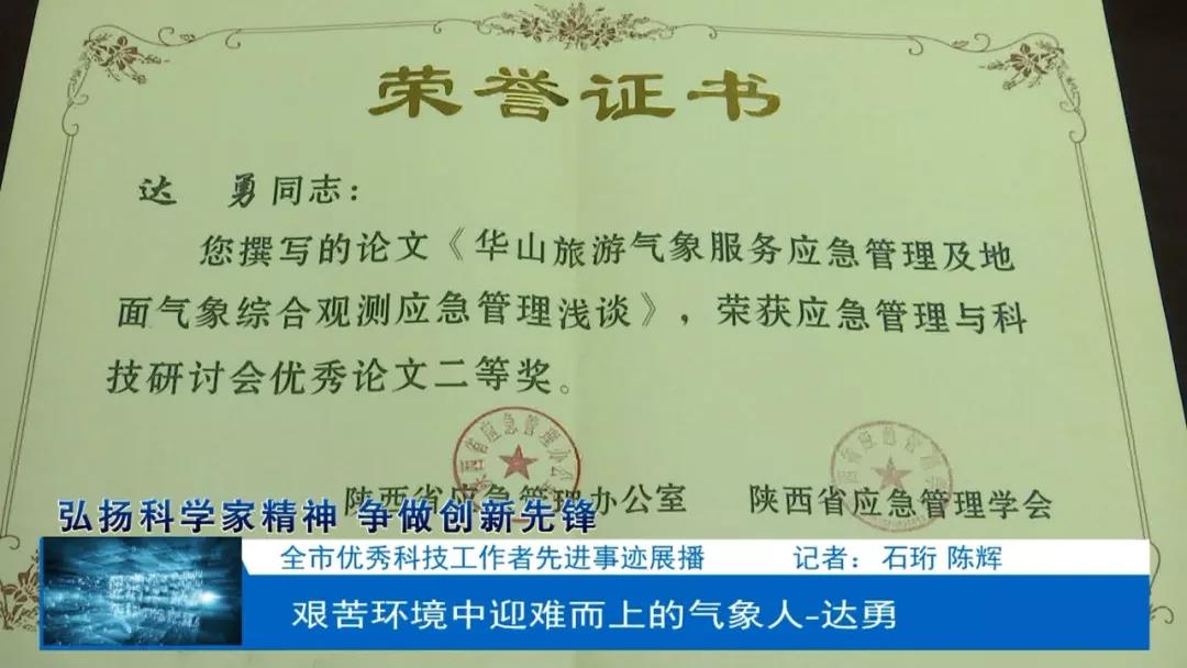 在2014年的时候,达勇通过平时在工作中的实践与总结,发表的科研论文《华山旅游气象服务应急管理及地面综合观测应急管理浅谈》,就荣获了陕西省应急管理与科技研讨会优秀论文二等奖,2016年到渭南市气象中心后,他更进一步在旅游气象服务方面进行专研。
