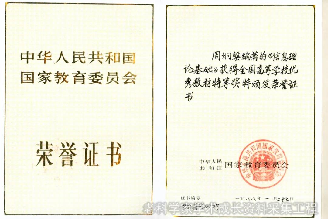 周炯槃的《信息理论基础》获国家教委特等奖证书