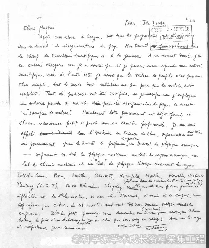 当年的12月3日,调职失败的钱三强给远在法国的老师写了一封信,信中提到他对从事科学组织和青年管理工作的顾虑,对自己能否回归科学研究事业的担心。他还写道,自己在做一件为了人民能获得最终胜利的大事,“所有的进步人士都被吸收到国家各个组织的重建工作中,全国有很多爱国同胞为此做出了牺牲,如果我能够用我一生的某个时段来参加国家的重建工作,我这也是‘为了胜利而牺牲’”。