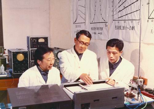高鸿(中)指导陈洪渊(右)、彭慈贞研究“近代极谱分析基础理论”课题。