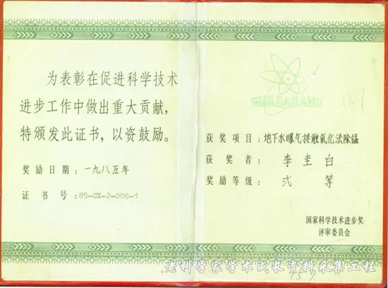 “地下水曝气接触氧化法除锰”于1985年获国家科学技术进步二等奖