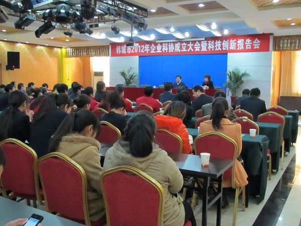 为进一步贯彻落实党的十八大报告中提出的“完善社会主义市场经济体制和加快转变经济发展方式,实施创新驱动发展战略,推进经济结构战略性调整,增强企业科技创新能力”。12月7日,韩城市在禹龙宾馆召开2012年企业科协成立大会。韩城市委常委常务副市长周新强主持会议,渭南市科协副主席陶东京、韩城市委常委沙利娜、人大副主任王云章、政协副主席王秀兰出席会议。会上,韩城市科协同意陕西陕煤韩城矿业有限公司、陕西拓盛实业有限责任公司、中国联通韩城分公司、陕西黄河煤化有限公司、陕西泰山置业集团有限公司、陕西梦特香陶瓷科技有限公司六个企业成立科学技术协会,并在会上宣读下发了批复。