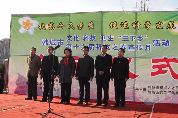 市委常委,宣传部部长党福勤、市人大副主任王云章为市科协、农业局、水务局、西韩工贸等20个下乡服务队授旗。党福勤希望,参加三下乡服务的各成员单位坚持以服务三农,服务基层为宗旨,把组织开展三下乡和科技之春宣传月活动作为加强三农工作的实际举措,抓实抓好,进一步丰富创新三下乡活动的内容和形式,将活动延伸到工厂企业,促进企业科技进步。坚持政府主导与社会参与相结合,坚持丰富内容和创新形式相结合,坚持“造”与“建”相结合,推动农村社区和企业的文化、科技、卫生等公共服务体系建设,加强领导,形成合力,健全完善组织运行机制,真正做到“三下乡”常下乡、常在乡。