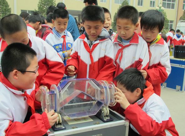 在科协工作人员和学校老师的引导下,24个班1200多名学生分批次参观了科普展品和科普展板。“龙池”、“ 会飞的碗”、“三棱镜”、“无源之水”、“看谁跑得快”、“拓扑游戏”、“磁悬浮地球仪”、“翻转的镜像”等 40多件科普展品和120余块防震减灾、海底世界全真麦吉立体图像科普展板,包含了电磁学、光学、力学、数学、生命科学、生物学、天文学等诸多方面的内容,把深奥的科学知识和科学原理寓于直观的演示之中,集知识性、趣味性、互动性为一体,彰显了独特的科普教育功能。面对这些新奇的科普展品,孩子们各个按捺不住内心的激动,踊跃上前亲自操作起来,奇妙的魔盘、摸不透的原理,通过演示和动手操作,其中的奥妙被揭开了,在场的学生们都开心不已,并不时发出惊叹之声,整个校园呈现出学习科普知识的浓郁氛围。