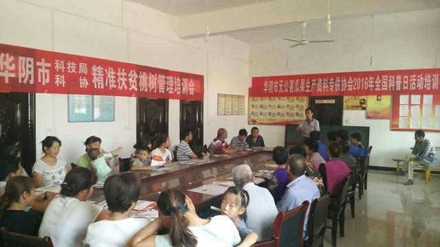 9月4日上午,华阴市科技局、科协和华阴市无公害瓜果生产资料专供协会邀请国家区域(渭南地区)果树专家刘玺老师,在华阴市华西镇北严村村委会议室开展“精准扶贫桃树管理培训会”,协会成员和桃树种植户80余人参加培训会。